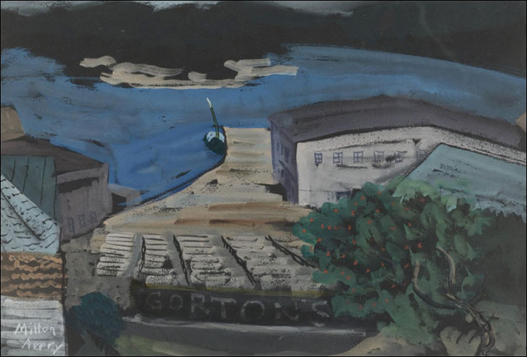 Gorton's Fishery (1935) Milton Avery (gouache on black newspaper 12 1/4 by 18 in.)