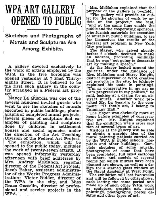An Art gallery, said to be the showtime of its kind sponsored by the Federal fine art project of the WPA, will open today at 3:thirty PM at 7 East Thirty-eighth Street with a private showing for 600 invited guests of work done by WPA artists in the city. Mayor La Guardia, Lily Pons and other notables are among the invited guests. Beginning tomorrow the gallery will exist open to the public betwixt 10 AM and 5 PM daily except Sundays and holidays.